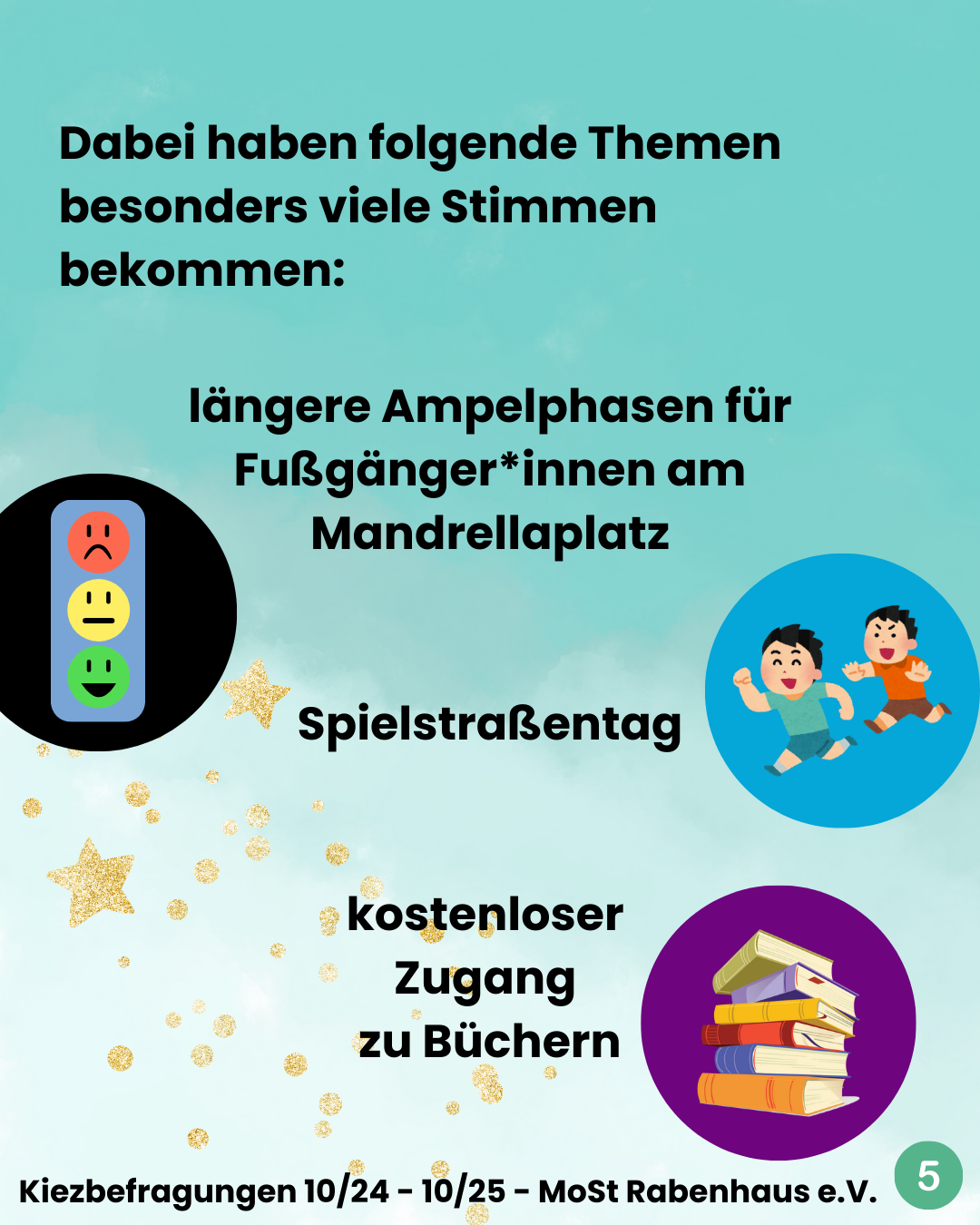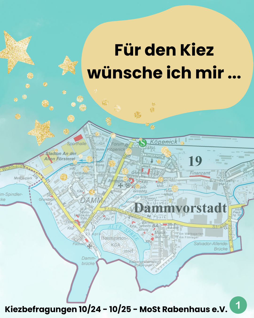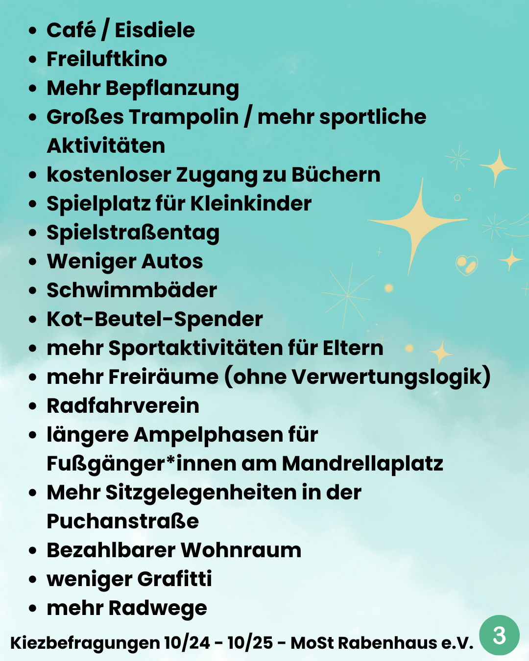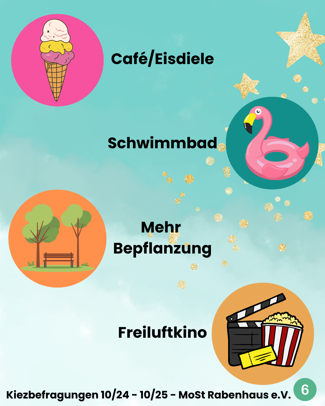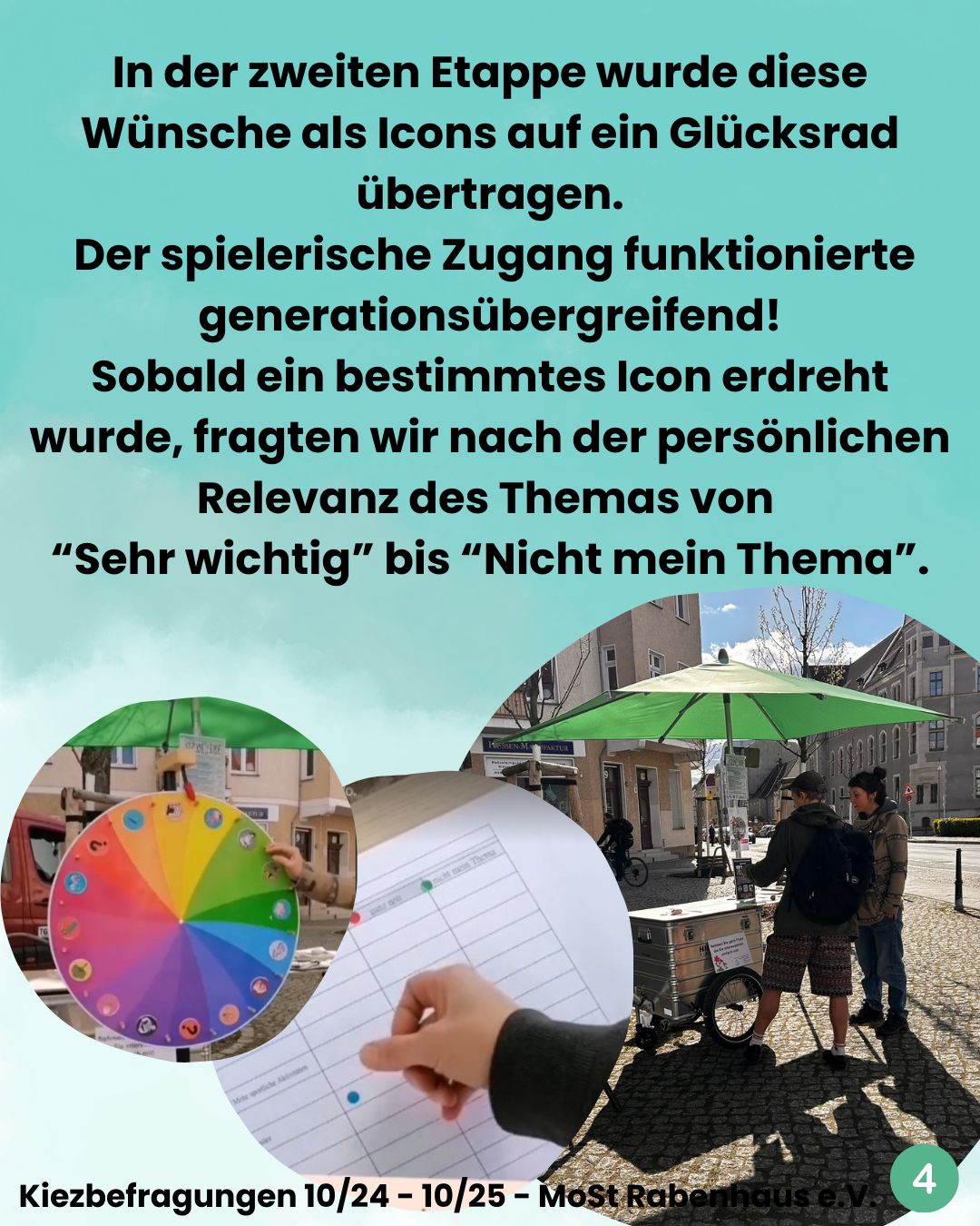 Von April 2025 bis Oktober 2025 wurden diese Wünsche mit Hilfe eines Drehs am "Kiezrad" von mehr Befragten verifiziert. Natürlich gab es auch die Möglichkeit neue Themen und Wünsche einzubringen.
